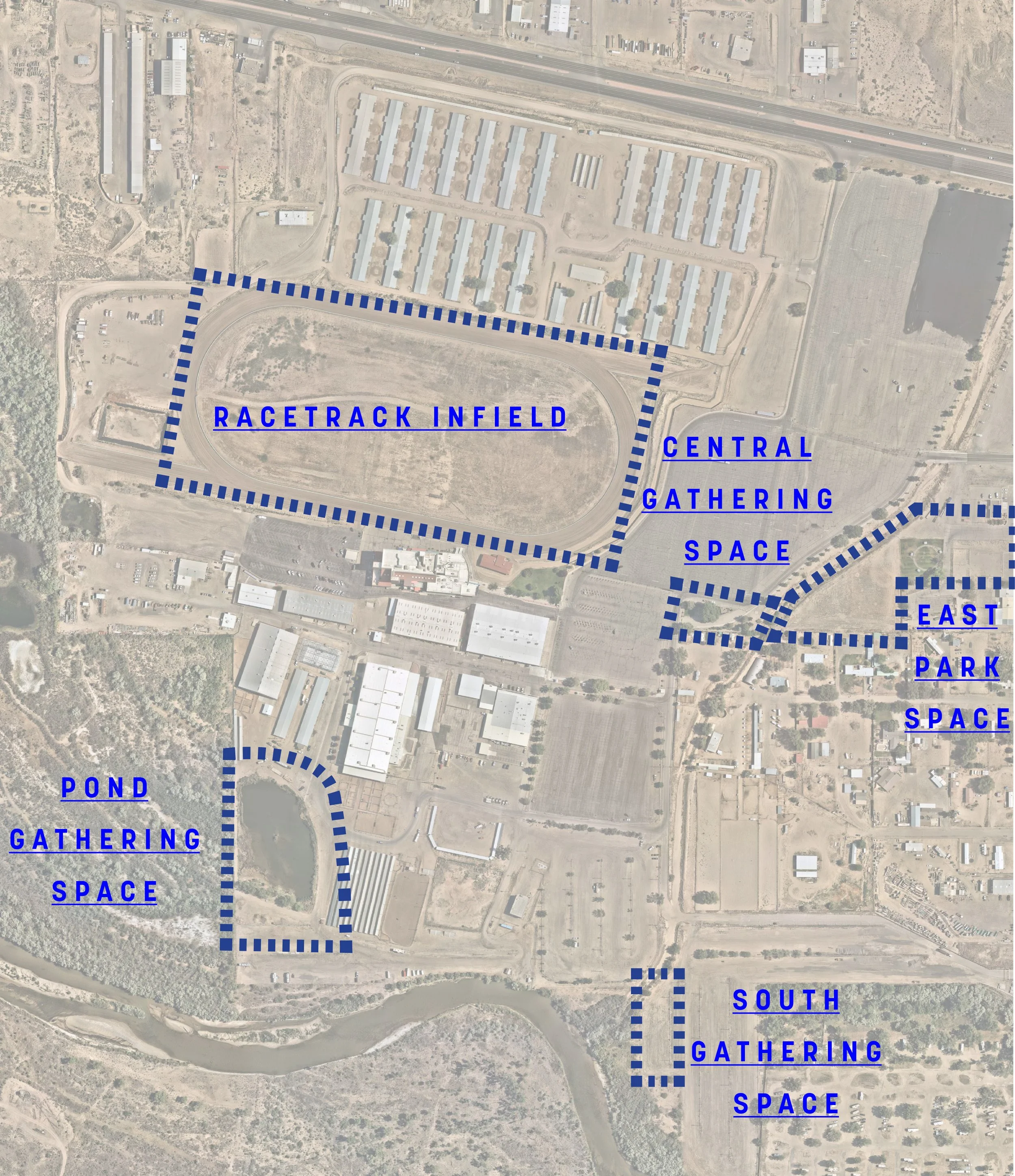The master plan consists of five primary areas of development. The East Park Space is located in the area west of the fire station and sheriff’s office along County Road 5500. The Central Gathering Space is the currently a small park area that has the large antique grader. The South Gathering Space is located adjacent to the south RV parking lot. The Pond Gathering Space is around the existing drainage pond in the southwest corner of the park. And, the Racetrack Infield is the open space that is surrounded by the race track.